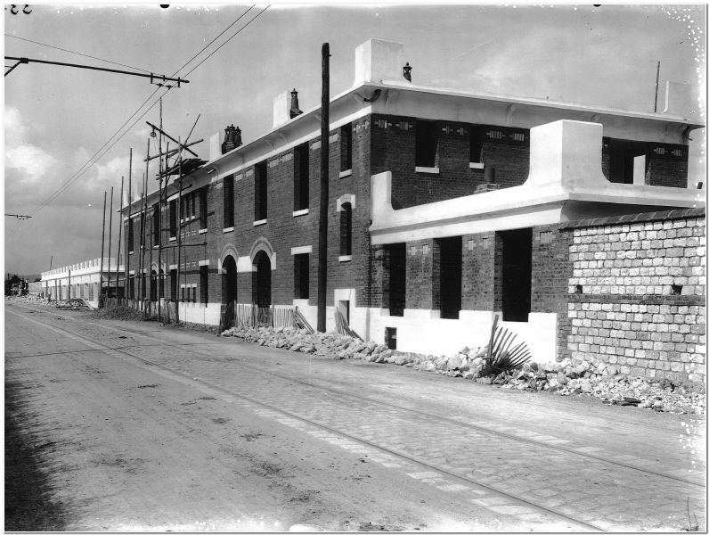 Construction des bureaux centraux de Quatre Mares en aout 1915. Les deux portes voutées permettaient au personnel d'accéder à l'intérieur des ateliers.