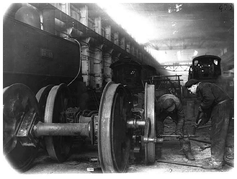 Travail sur des essieux moteurs de machine ŕ vapeur. On voit, ŕ l'intérieur des roues, les boites d'essieux rectangulaires qui renferment les coussinets et les rainures de graissage.