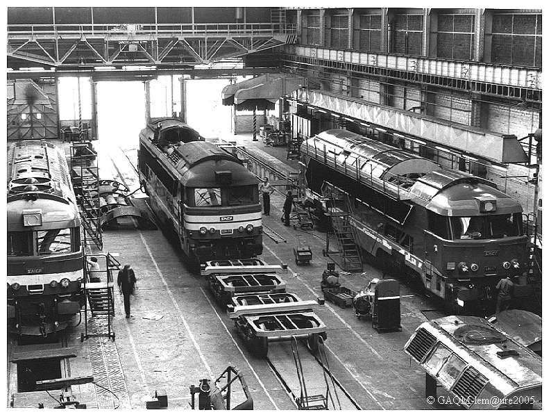 Sur les côtés gauche et droit, des locomotives sont en cours de finitions.Dans le bas à droite, un élément de toiture de CC 65000. Sur la voie centrale une 68000 venue pour une "RA moteur diesel". Sur sa droite, en "marcel", votre serviteur. Nous sommes en 1982