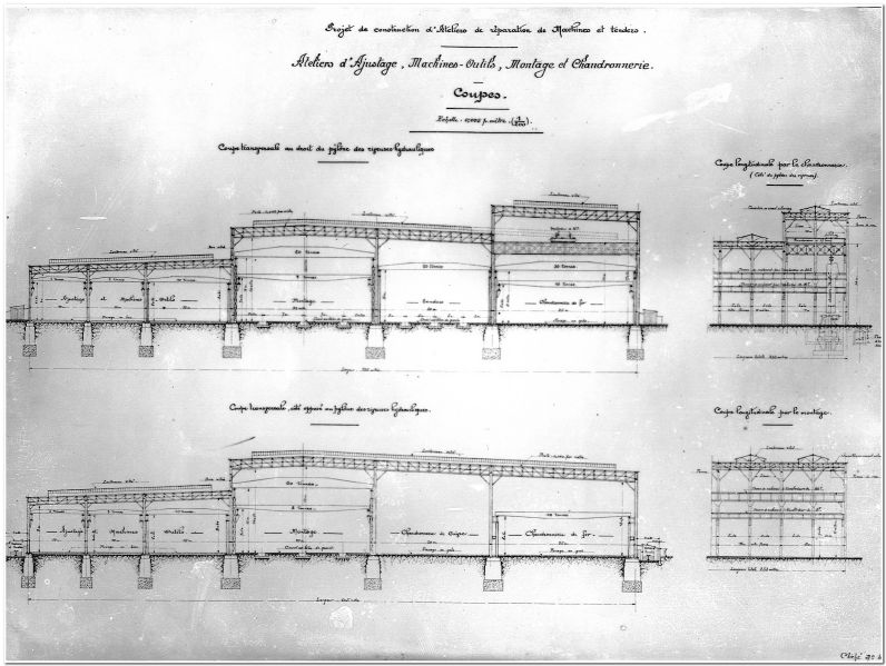 Projet de construction daté de 1912. Dans l'étude il a été prévu des toitures plates à deux versants avec une pente de 4 cm/m. Cette disposition spéciale ne sera pas retenue