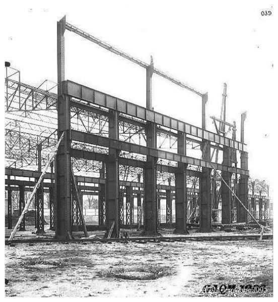 Les prémices de ce qui sera le hall "C", l'atelier du montage des locomotives. On distingue les chemins de roulement des ponts roulants de 60 tonnes et 8 tonnes. - février 1916
