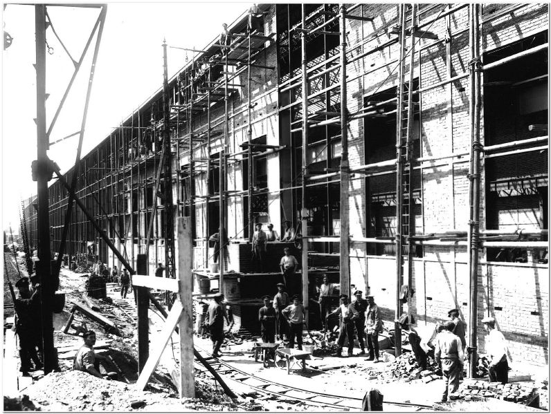 Remplissage en brique de la face côté voie du Hall "A" par les Anglais en juin 1917. Les militaires britaniques ont pris possession des ateliers en vertu d'un accord passé avec les Chemins de fer de l'Etat