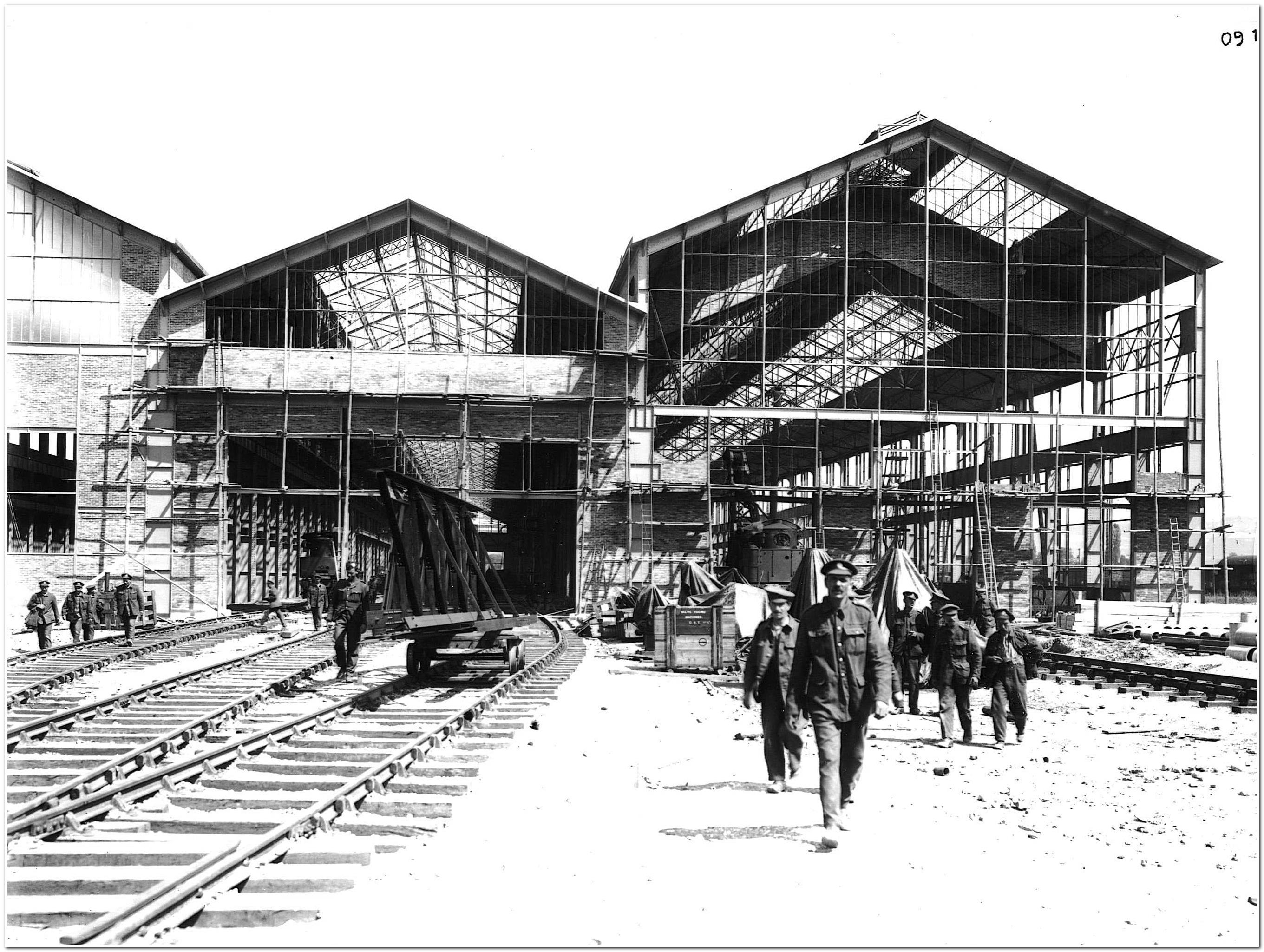 Les militaires du Royal Engineer's Corps finissent la construction des bātiments. Ici en juin 1917 devant les pignons des halls "A" et "B".