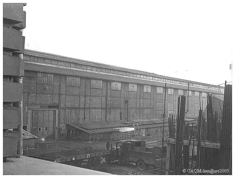 Prise d'une des fenêtres des nouveaux bureaux en construction, cette photo ouvre sur le long pan de mur du hall "F" rénové. Au centre une autre camionnette au gazogène.