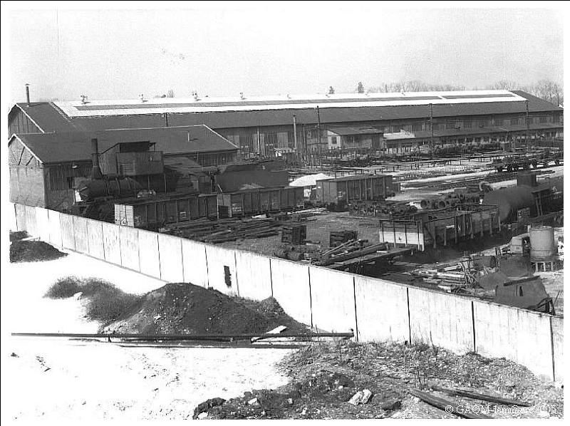 A gauche, le long du bâtiment de détartrage des tuyauteries, la locomotive qui servait de centrale de chauffe.