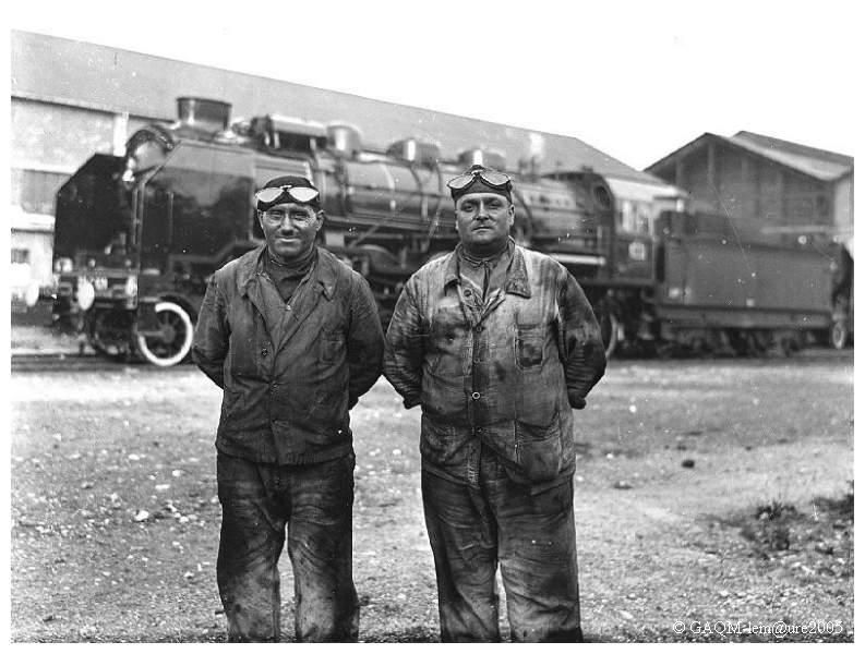 Machine sortant de grande révision, ici la 231 G 629 du dépôt de Caen, et son équipe de conduite, mécanicien et chauffeur.