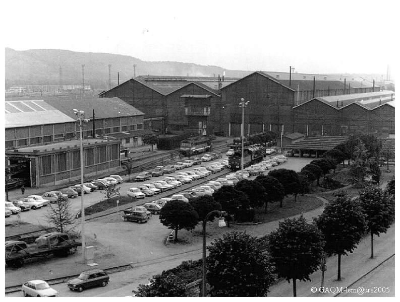 Vue du pignon côté Rouen avec devant les portes une locomotive à vapeur et une des premières AIA AIA 68000