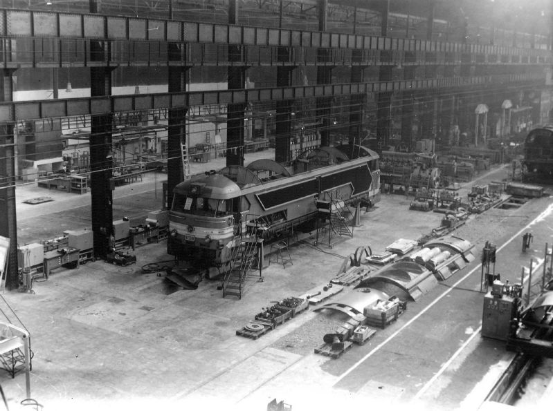 Sous un autre angle, on remarque que la locomotive repose sur des plots qui encadrent une fosse qui a été adaptée aux nécessités nouvelles. Dans l'atelier adjacent, les chantiers spécialisés aux divers composants thermiques prennent peu à peu leurs places.