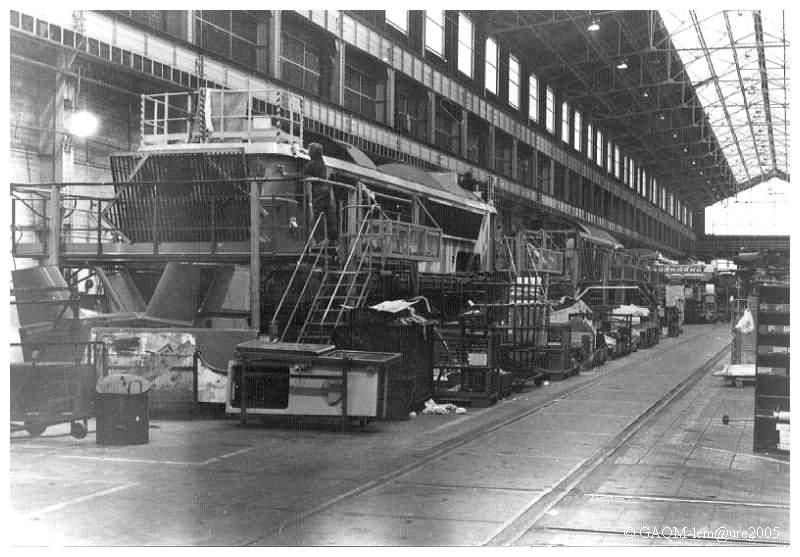 Sur la gauche, au poste de "Mi-Vie", une 68000 en cours de peinturage. Devant elle, posées sur le sol, deux parois frontales en complexe de polyester sont en attente de préparation.