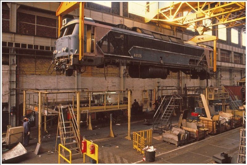 Après le renforcement de ses cabines, la 68515 est levée et va rejoindre ses bogies sur les voies de sortie