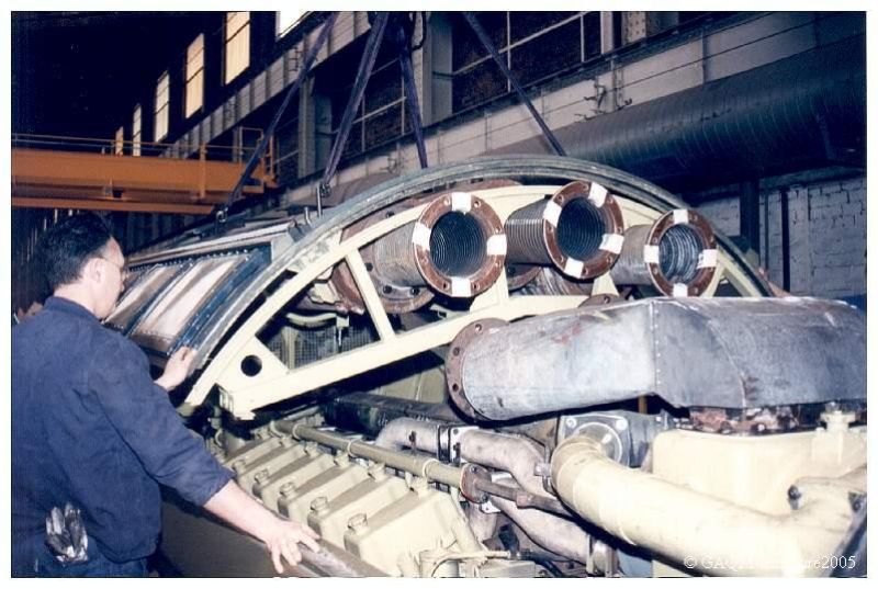 On peut voir ici la dimension des trois silencieux d'échappement et celle de l'élément de liaison avec l'unique turbocompresseur.