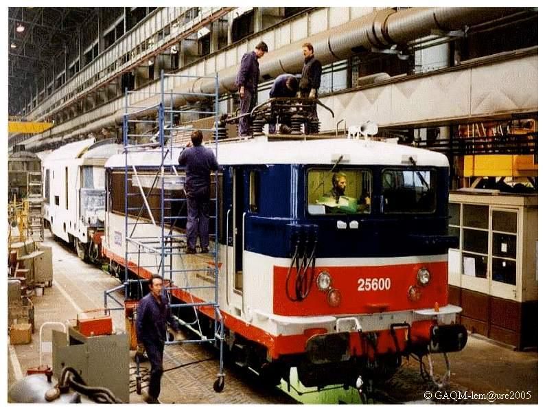 Réglage des pantographes de la BB 25600 sur la voie 43. Derrière elle, une BB 67400 enduite attend son acheminement vers la cabine de peinture situé derrière la "Babcok"