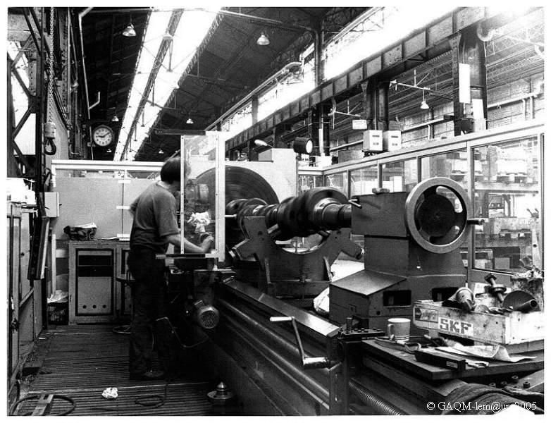 Rectification d'un vilebrequin dans le hall "E". Noter la dimension du plateau et de la poupée mobile par rapport à la taille de l'agent.