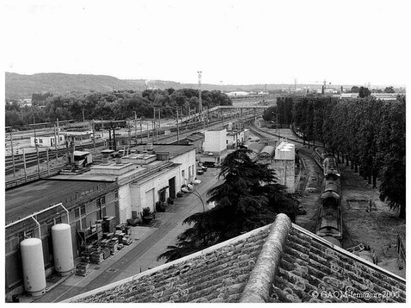 Vue de la cour côté Paris prise du toit du hall "C". Sur la gauche, les bâtiments des compresseurs et les bancs d'essais des moteurs diesel. Au fond celui du tarage.