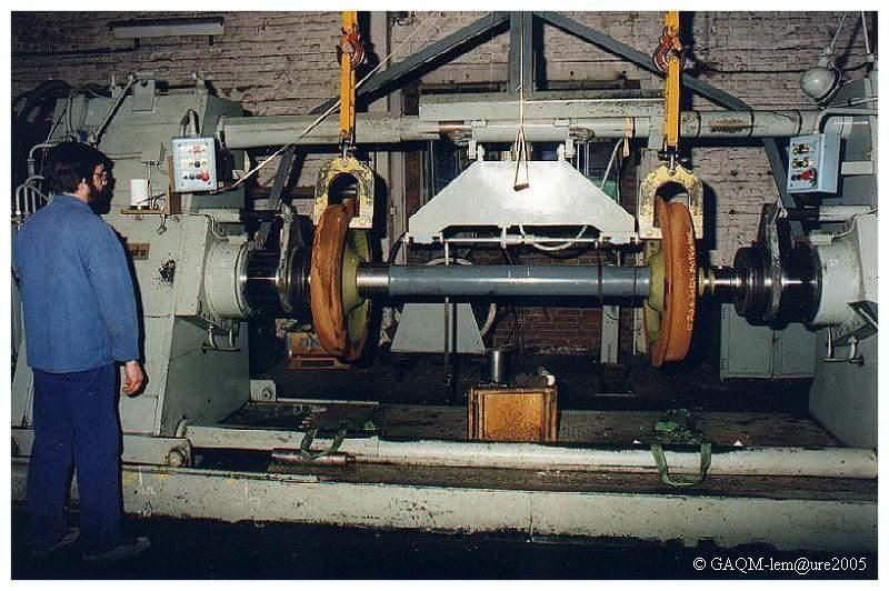 Calage des roues sur un essieu dans l'atelier de Roues.