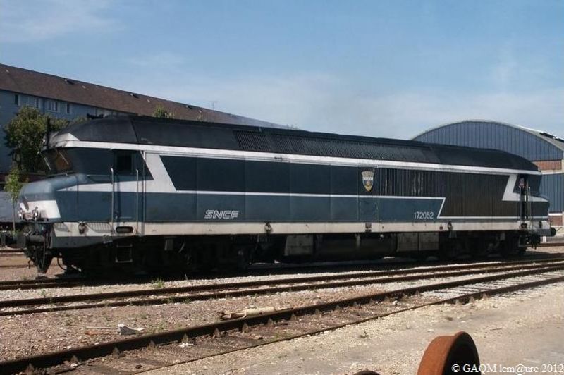 CC 72052 en livrée d'origine. Les CC 72000 forment une série de locomotives Diesel-électriques construites à 92 exemplaires pour la SNCF par Alstom. Elles ont été commandées le 29 décembre 1965 et la première a été mise en service le 20 décembre 1967 au dépôt de Rennes, la dernière le 21 juin 1974. Equipées d’un moteur AGO V 16 ESHR elles peuvent être utilisée sous deux puissances d’utilisation. En régime économique, 1230 tr/min – 3150 ch et en régime maximal, 1350 tr/min – 3600 ch, elles seront bloquées sur la fin de leur carrière à 3150 ch. Utilisable sous deux réduction M 85 km/h / V 140 ou 160 km/h. Ces locomotives permirent de démocratiser la vitesse sur les lignes thermiques radiales ou transversales de concert avec les turbotrains, avec la pratique du 160 km/h, notamment en tête des trains corails sur Lyon – Nantes, Paris – Bâle, Paris – Nantes et Paris – Clermont-Ferrand.