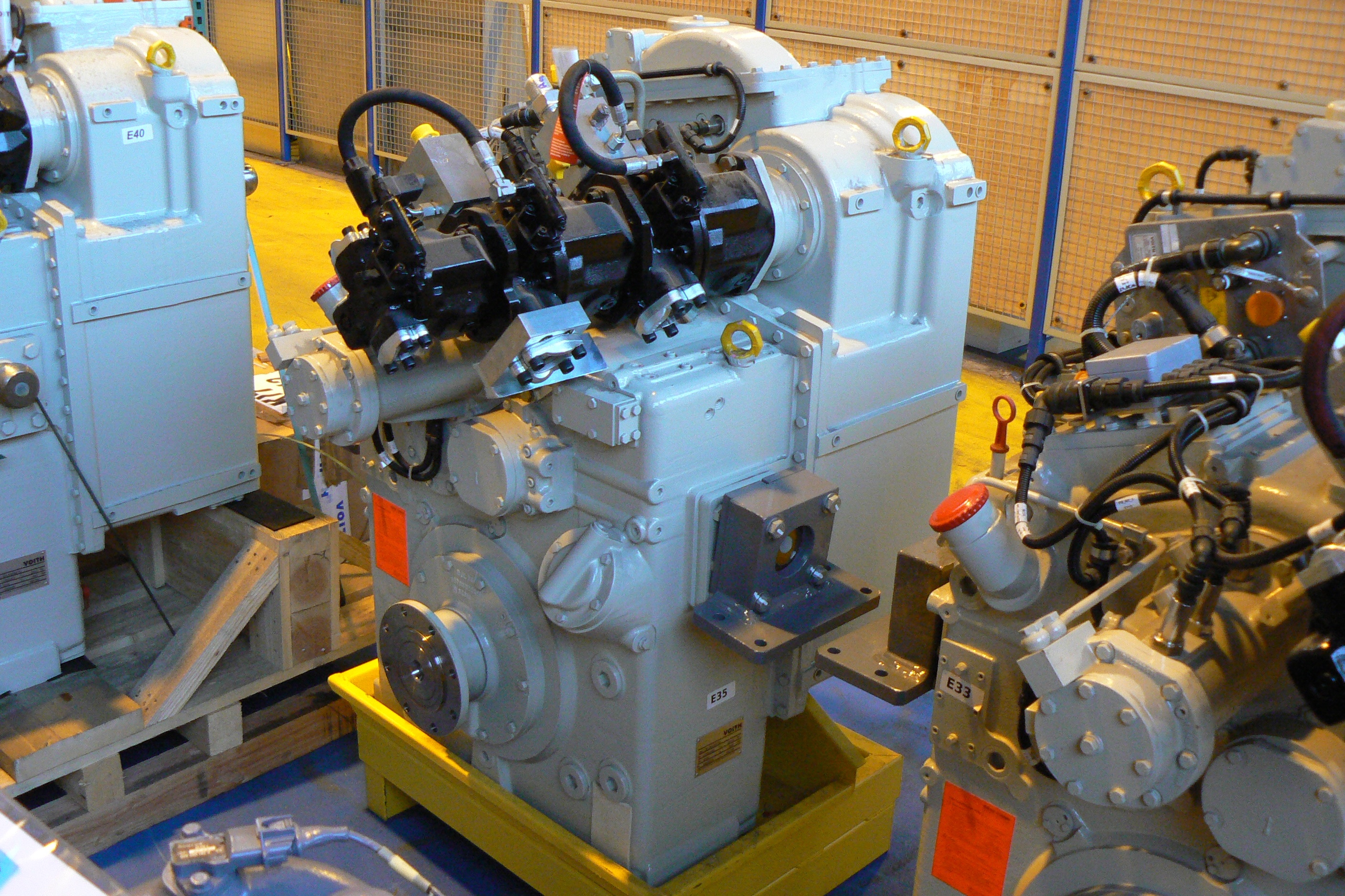 La turbotransmission VOITH L220 reV2 est l’interface mécanique entre le moteur diesel et les ponts. La turbotransmission est entraînée par le moteur diesel via un cardan accouplé à l’arbre d’entrée.